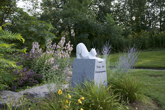 La section consacrée aux cendres canines est située autour d’une superbe sculpture créée et nommée « Totem Méditatif » par l’artiste québécois DeLeclerc. La section dédiée aux cendres félines est aménagée autour d’un obélisque de granit rouge rubis , entouré de magnifiques sculptures de chats.